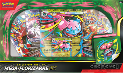 1 carte promo brillante de Méga-Florizarre-ex, 1 carte promo grand format lenticulaire de Méga-Florizarre-ex, 1 autocollant réajustable à l'effigie de Méga-Florizarre, 8 boosters du JCC Pokémon