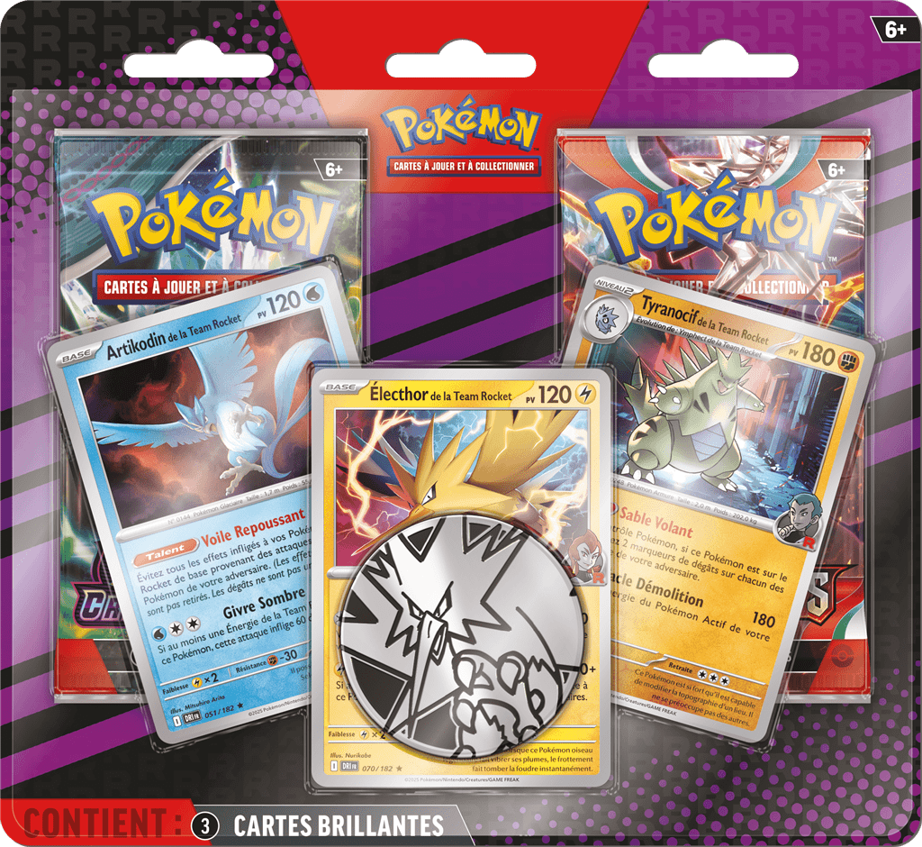 Enrichissez votre collection avec trois cartes brillantes du JCC Pokémon d'Artikodin de la Team Rocket, Électhor de la Team Rocket et Tyranocif de la Team Rocket, plus une pièce métallisée et deux boosters du JCC Pokémon.